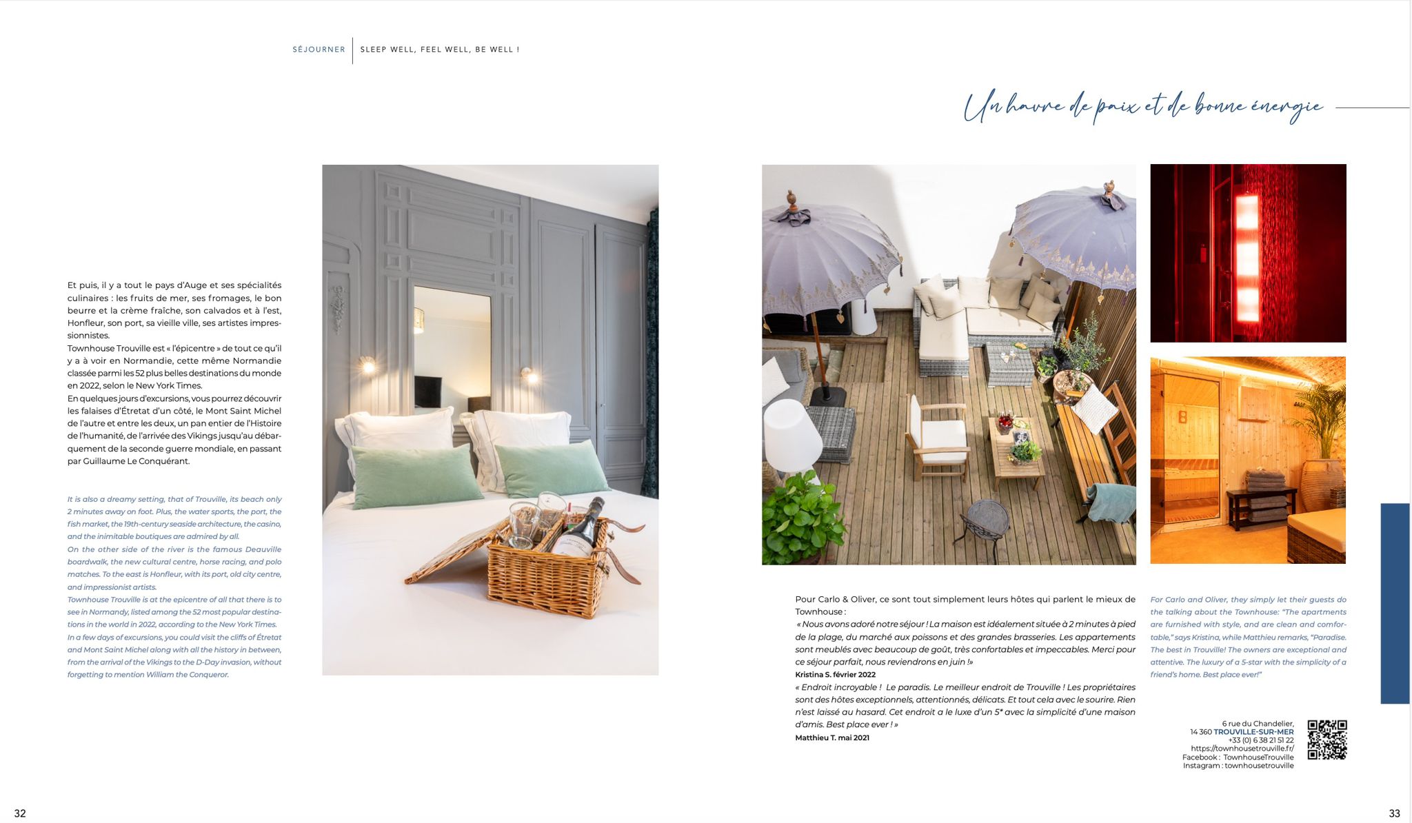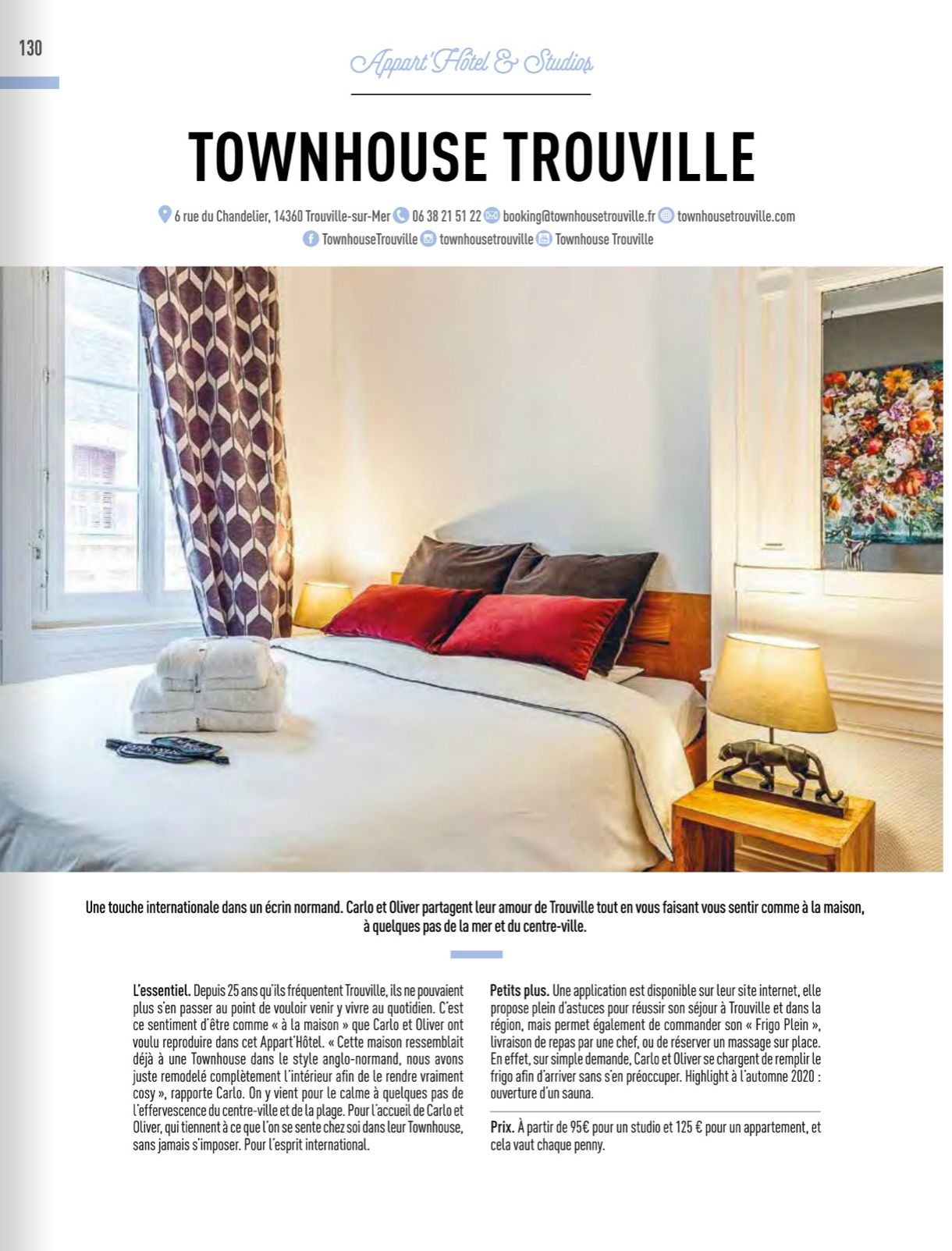 Le plus simple est de réserver directement sur notre site web, par e-mail(contact@townhousetrouville.fr) ou par WhatsApp(+33 6 38 21 51 22). Les réservations directes offrent les meilleures conditions et la plus grande flexibilité.