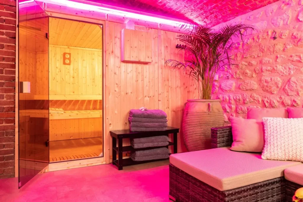 Faites l'expérience d'une détente harmonieuse dans notre sauna bio moderne - avec chromothérapie et aromathérapie pour le corps et l'esprit.